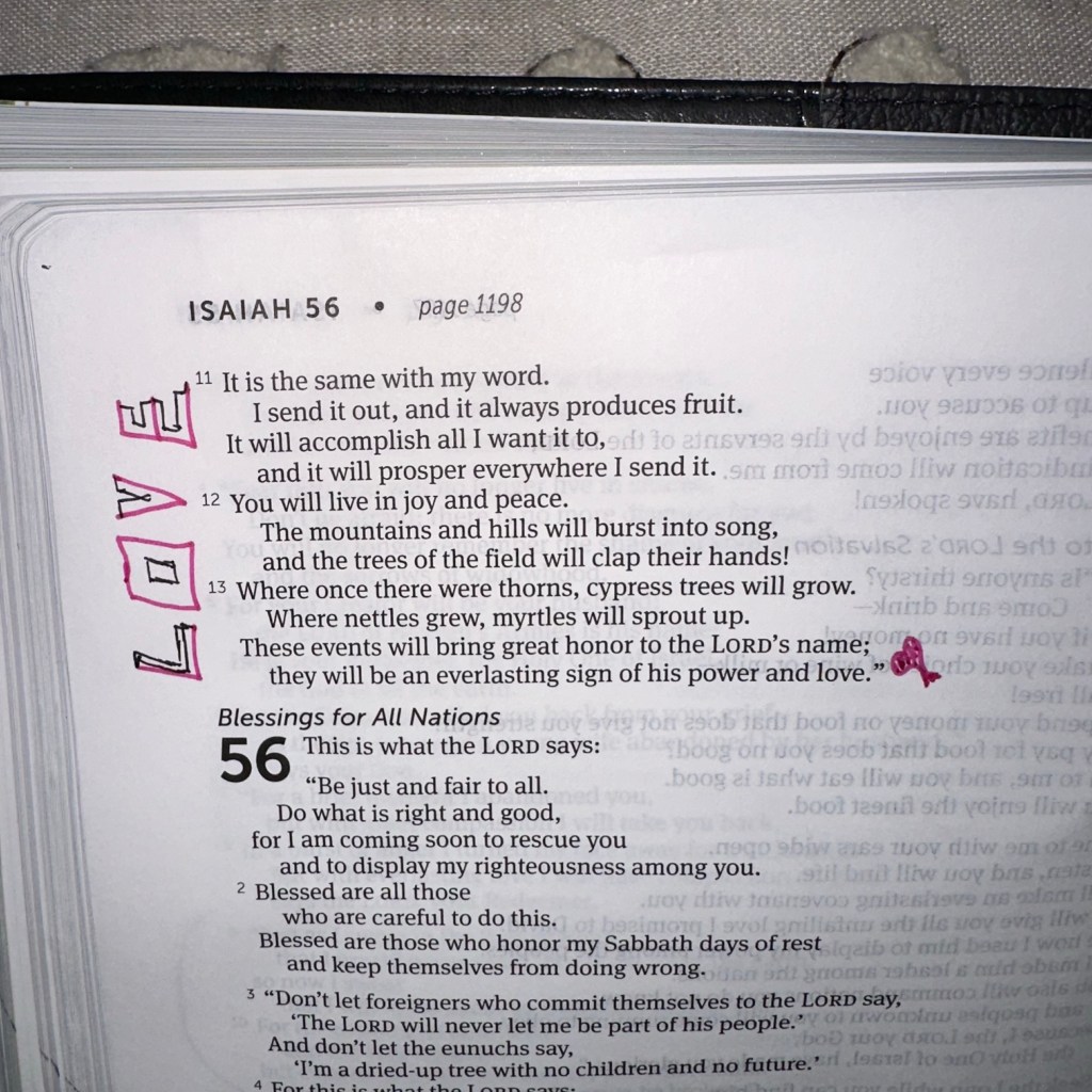 “”The rain and snow come down from the heavens and stay on the ground to water the earth. They cause the grain to grow, producing seed for the farmer and bread for the hungry. It is the same with my word. I send it out, and it always produces fruit. It will accomplish all I want it to, and it will prosper everywhere I send it.”